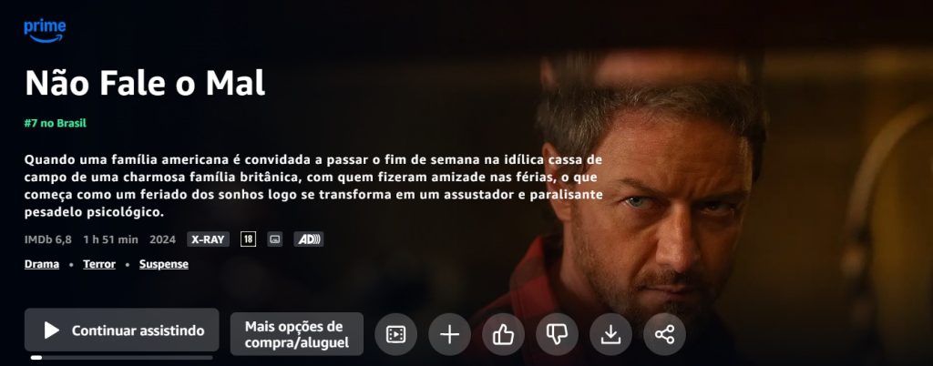 Chegou no streaming Prime Vídeo o filme ‘Não Fale o Mal‘ (Speak No Evil), de 2024! É a oportunidade de quem não pode ver nos cinemas, ver no conforto da sua casa com um balde de pipoca!