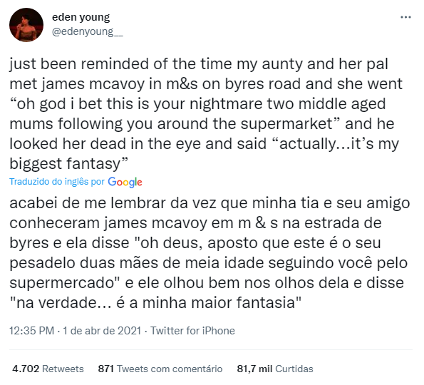 Há uma história de James McAvoy que eu amo. Não é aquela sobre ele sendo lambido no rosto por um fã bêbado em uma noite em Glasgow no início dos anos 2000, embora eu também ame essa história. Nem aquela em que uma fã tenta convencê-lo a assinar um Funko Pop de outro ator. Esta, a história da M&S, tem 80.000 curtidas no Twitter. Vou deixar que o tweeter original explique: “Acabei de me lembrar da vez em que minha tia e sua amiga conheceram James Mcavoy no m&s na estrada de Byres e ela disse ‘oh Deus, aposto que este é o seu pesadelo, duas mães de meia-idade seguindo você por aí no supermercado’ e ele olhou bem nos olhos dela e disse ‘na verdade… é a minha maior fantasia’”. McAvoy ri quando conto isso a ele textualmente. “Definitivamente não é minha fantasia final. Não me lembro disso. Ele não contesta que isso aconteceu, no entanto. “Fico feliz que alguém realmente ouça a merda que eu digo a eles, porque geralmente as pessoas sempre ficam vidradas quando digo coisas que acho espirituosas.” Sua parte favorita, quando ele ouve a pergunta “De onde eu te conheço?”, é responder completamente sem expressão que ele faz muito pornô gay. “Geralmente é quando eles estão com suas esposas. Honestamente, acho isso hilário, mas eles não me respondem nada. Vamos lá!”