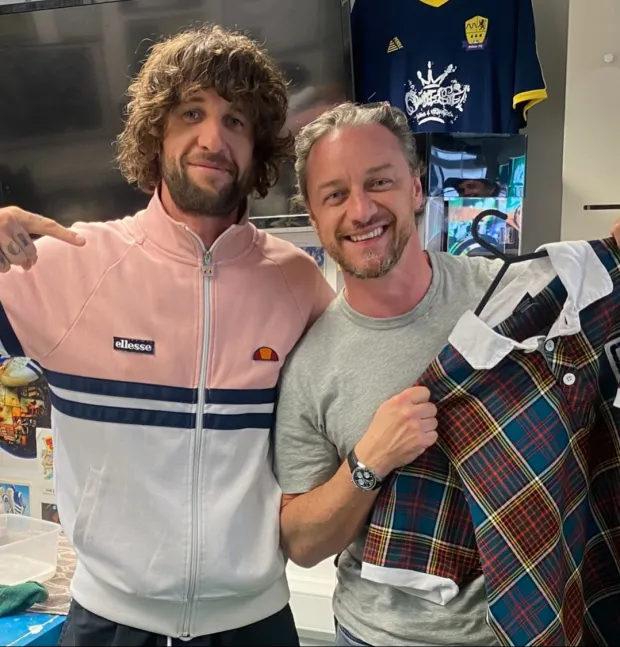 James McAvoy era só sorrisos enquanto posava com a equipe de uma loja, segurando uma camisa vintage do Dundee FC. A foto foi compartilhada nas redes sociais, junto com a legenda: “Apenas um sábado normal no Dundee Sole.”